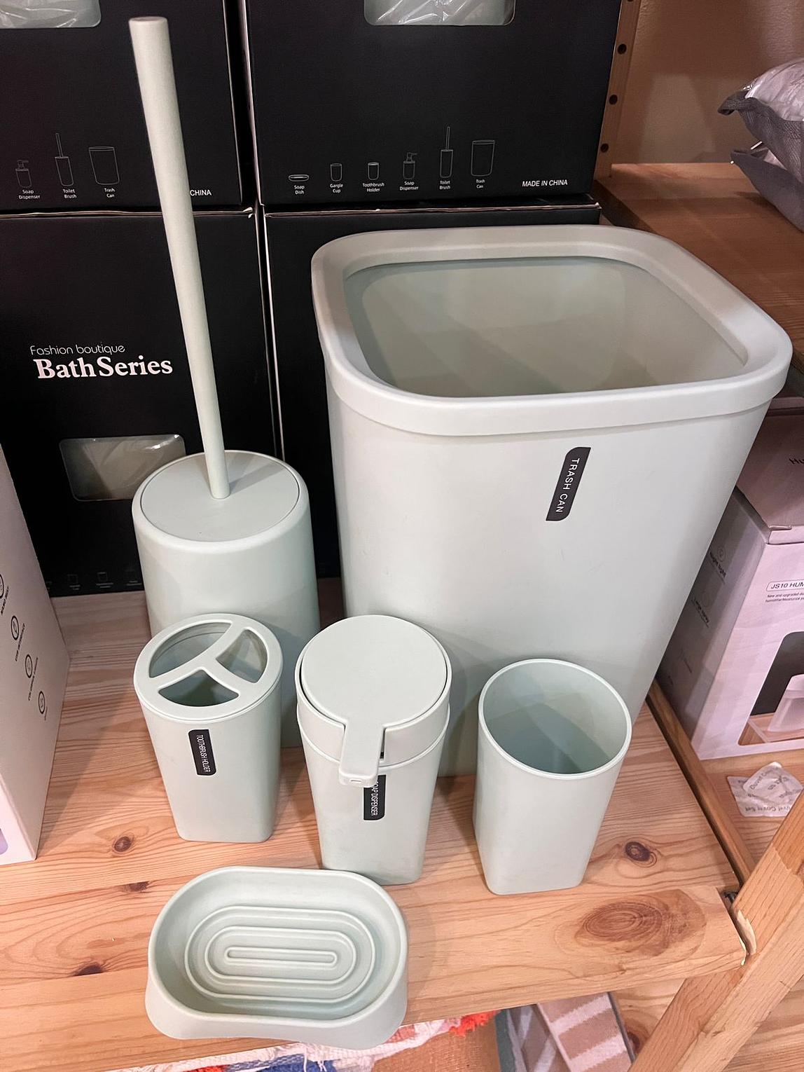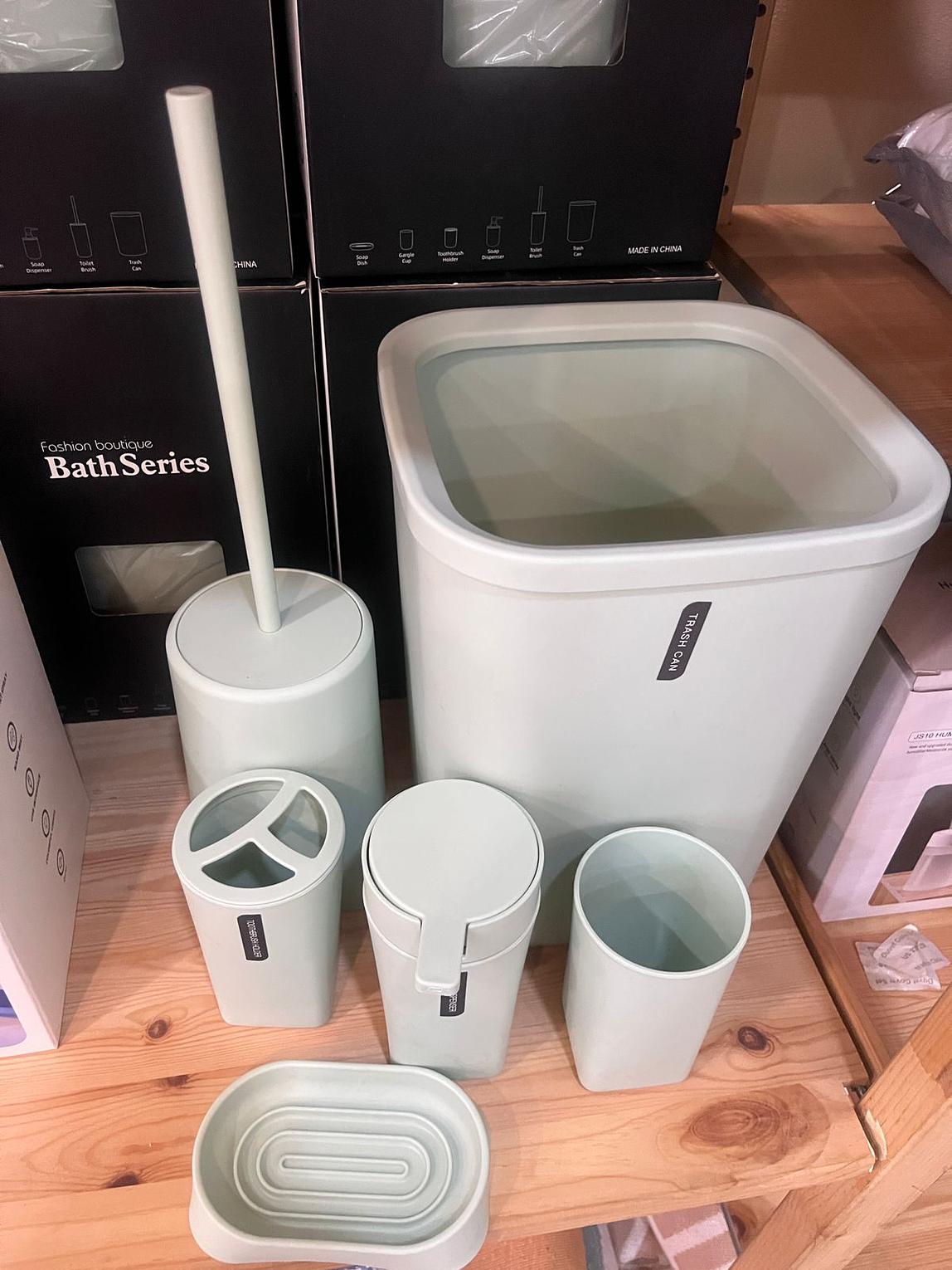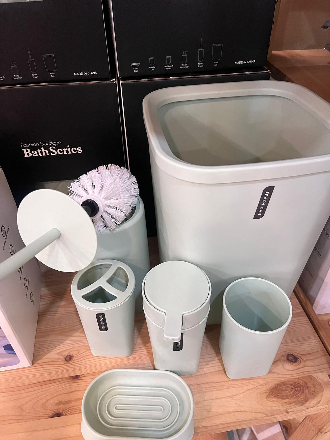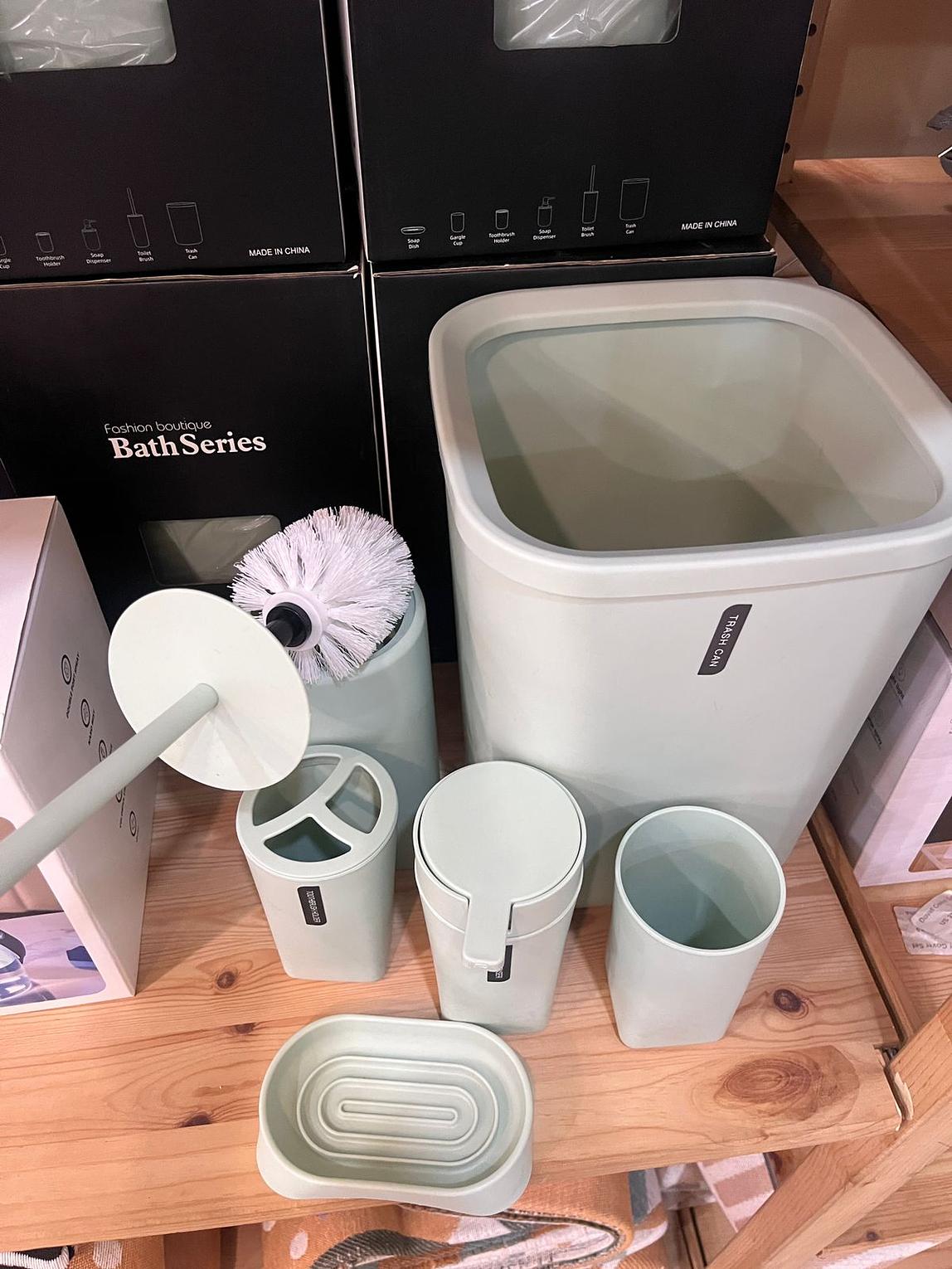 Lotion/Soap Dispenser, Gargle cup, Soap Dish, Toothbrush holder, Toilet Brush, Trash Can