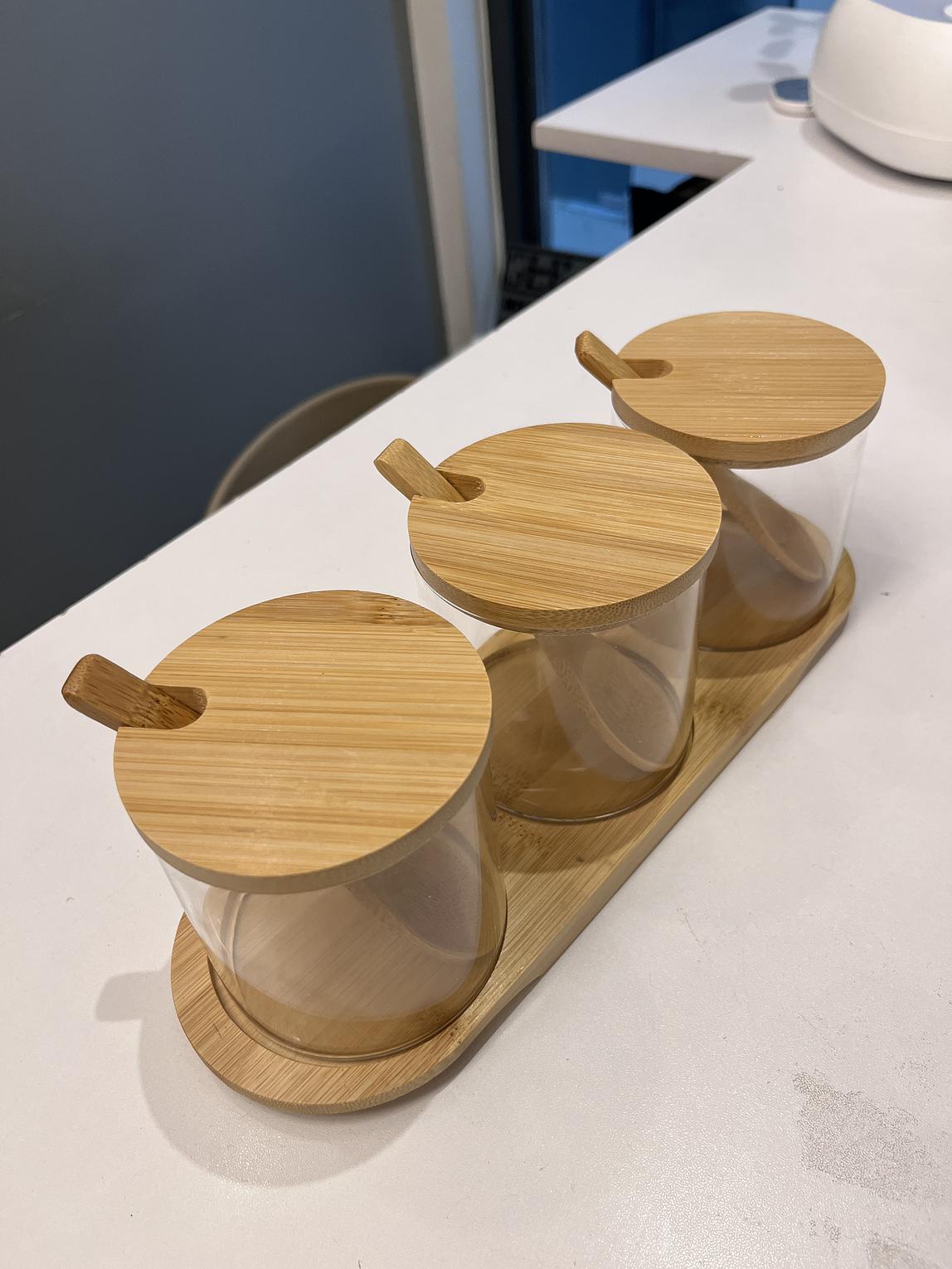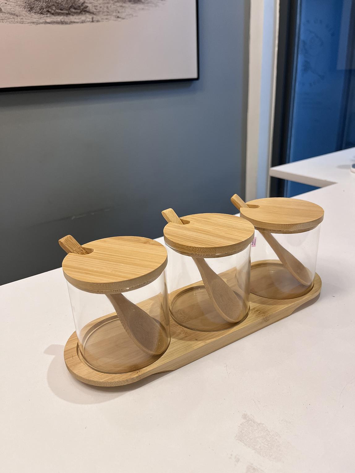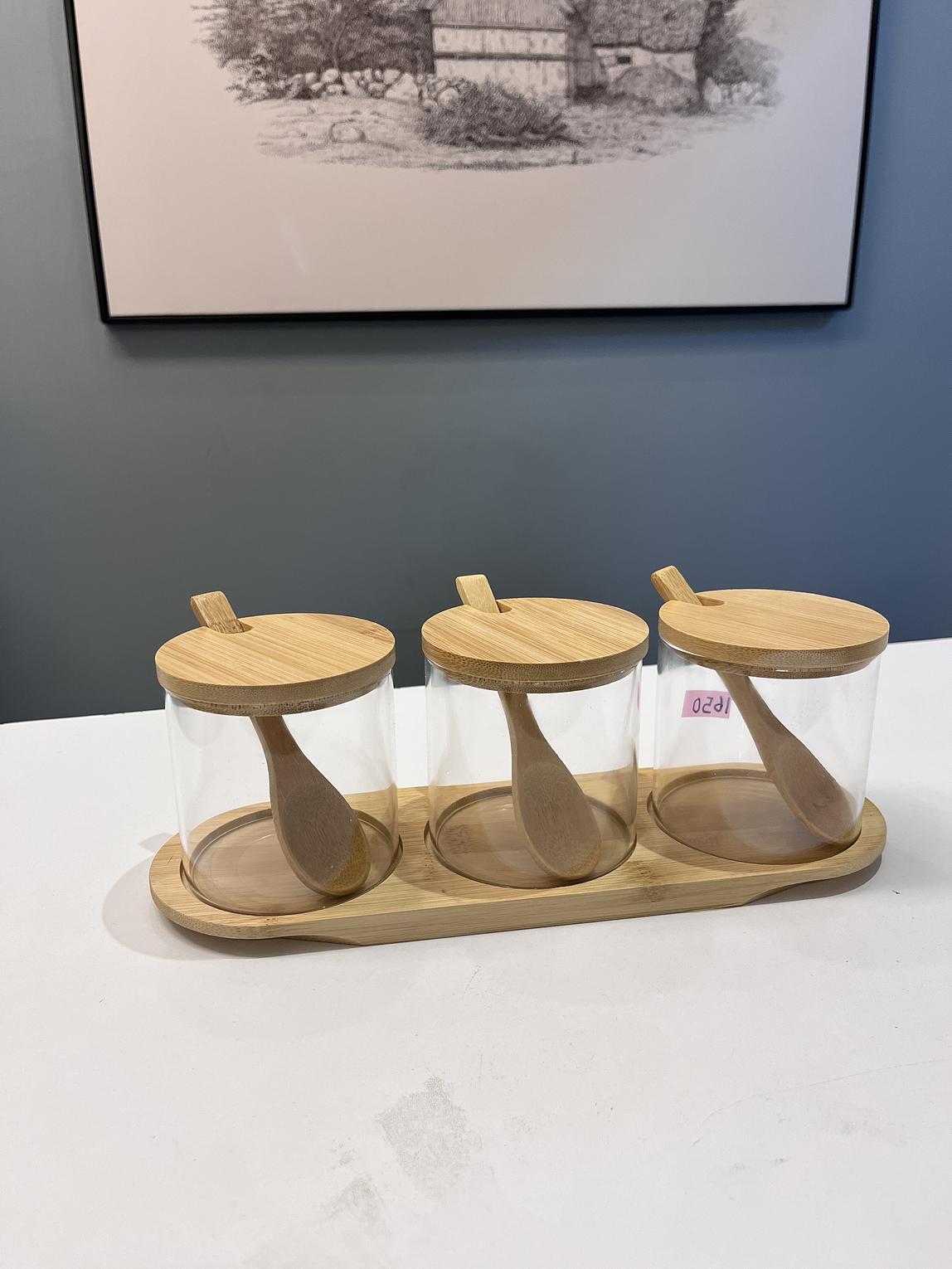 Bamboo glass jars with spoons and a base holder